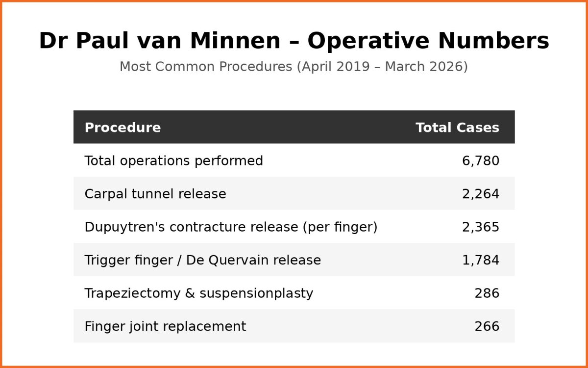Dr Paul van Minnen MD, PhD, EBOPRAS, FRACS (Plast) is a Specialist Plastic & Reconstructive Surgeon who has focused his clinical practice exclusively on hand and wrist surgery since 2015. He provides bespoke specialist care for adults with upper limb conditions, combining technical skill with a personal, respectful, and affable approach.